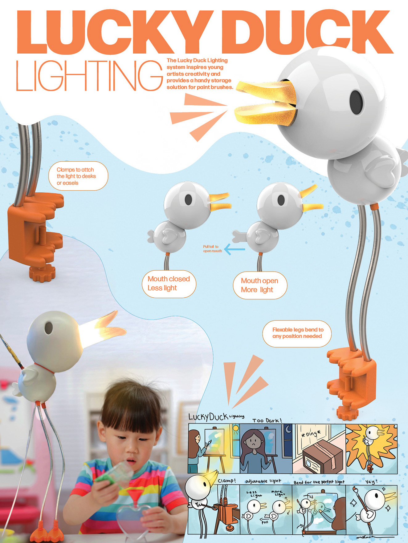 Lucky Duck Lighting reimagines lighting for artists in a fun and inspiring way. With its bendy legs, the lamp can provide lighting from every angle. In addition, its helpful hands are an easy way to hold paint brushes during breaks.